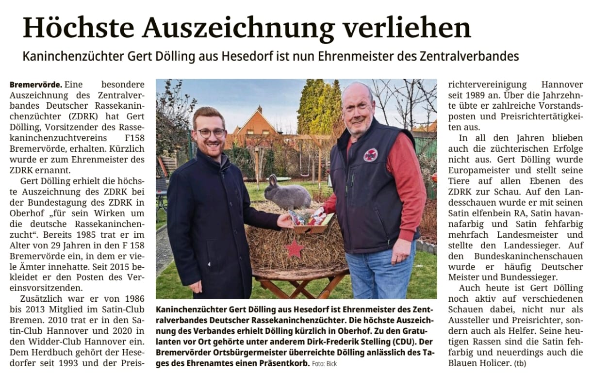 Die Bremervörder Zeitung berichtete kürzlich über die besondere Auszeichnung unseres Vorsitzenden Gert Dölling. Anlass war der Besuch des Ortsbürgermeisters, der persönlich den Vereinen und ihren Vorsitzenden für ihr langjähriges ehrenamtliches Engagement dankte. |